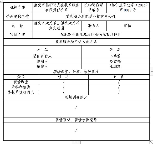 重庆鸿荣新能源科技有限公司三驱综合新能源站职业卫生评价