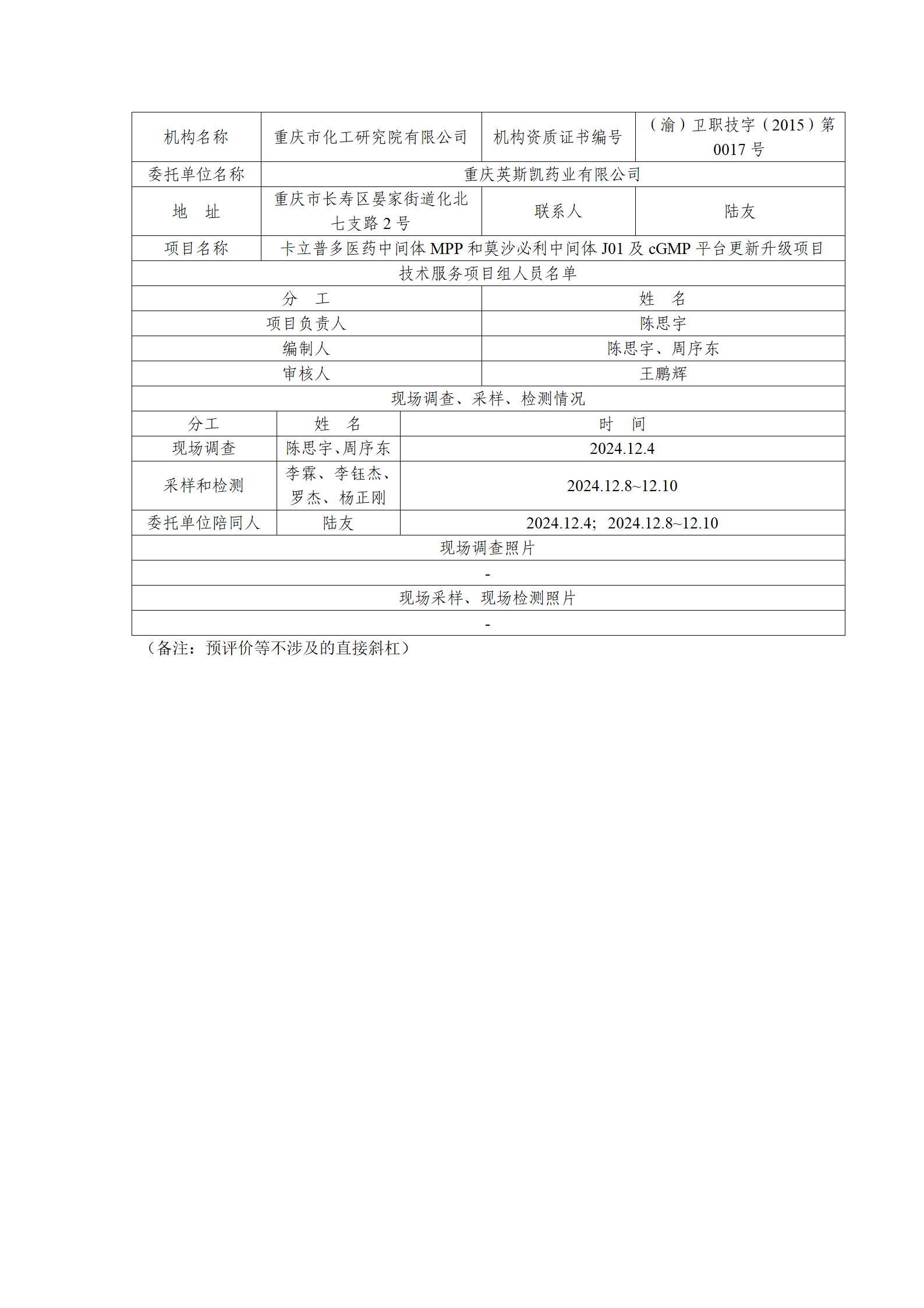 重庆英斯凯药业有限公司卡立普多医药中间体MPP和莫沙必利中间体J01及CGMP平台更新升级项目