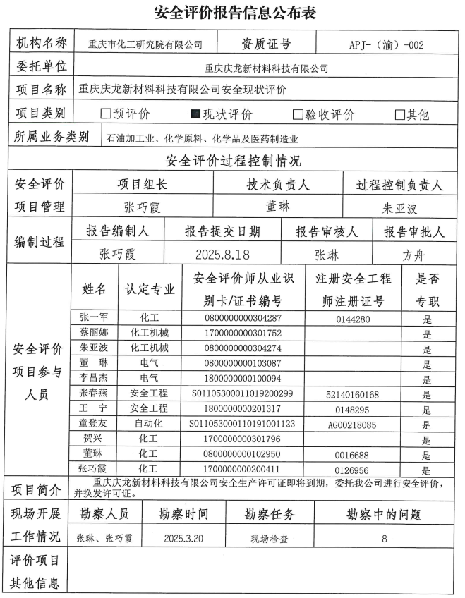 2025年第4季度重庆庆龙新材料科技有限公司安全现状评价信息公布表及附现场图片