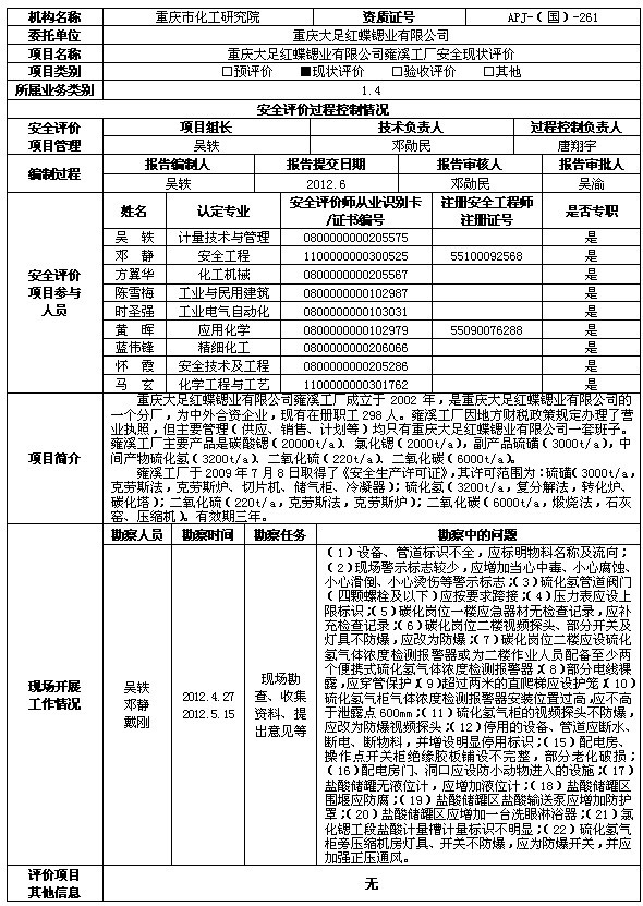重庆大足红蝶锶业有限公司雍溪工厂安全现状评价