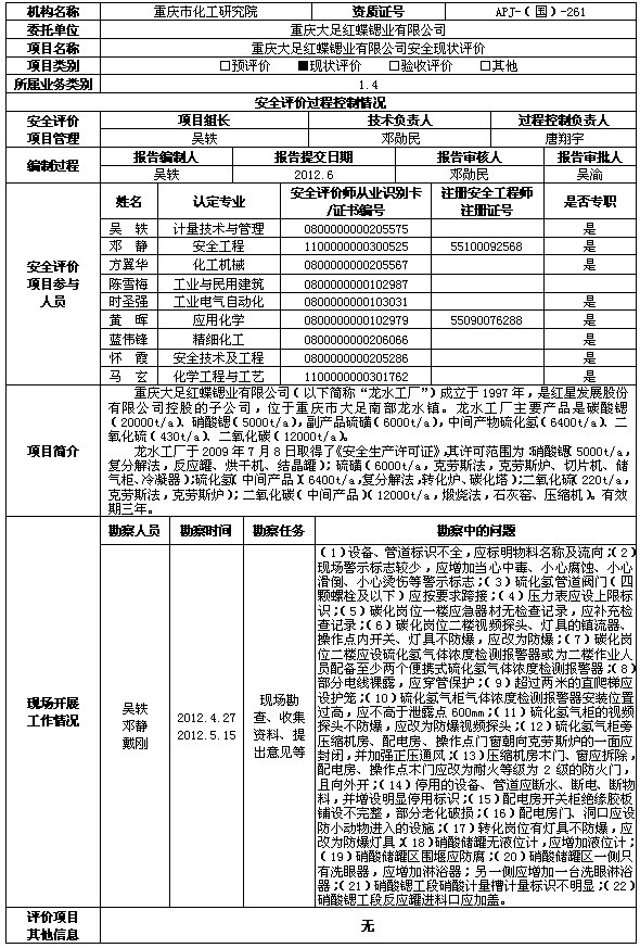 重庆大足红蝶锶业有限公司安全现状评价