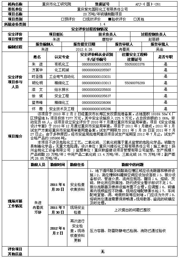 重庆紫光国际化工有限责任公司20万吨/年硫磺制酸项目验收安全评价