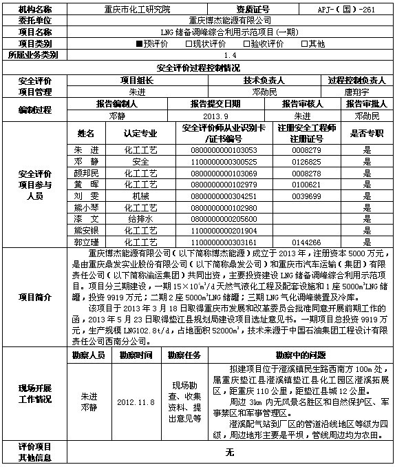 2013年3季度-重庆博杰能源有限公司LNG储备调峰综合利用示范项目(一期)设立安全评价