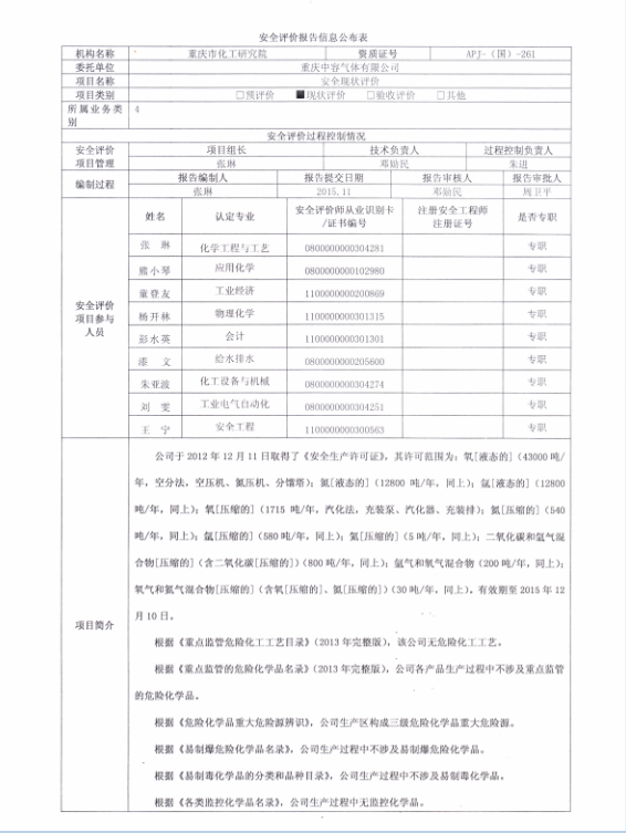 2015年4季度-重庆中容气体有限公司 安全现状评价