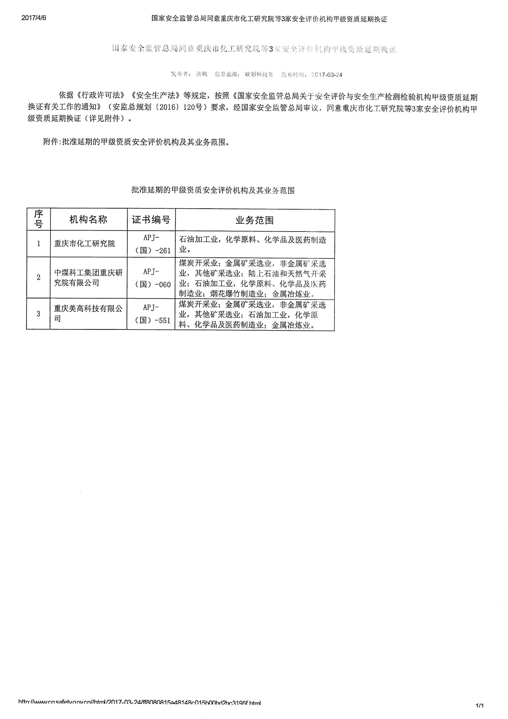 国家安全监督总局同意重庆市化工研究院等3家安全评价机构甲级资质延期换证