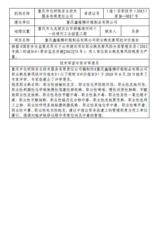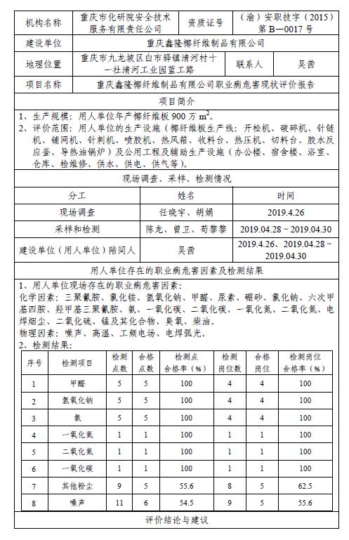 重庆鑫隆椰纤维制品有限公司职业病危害现状评价报告
