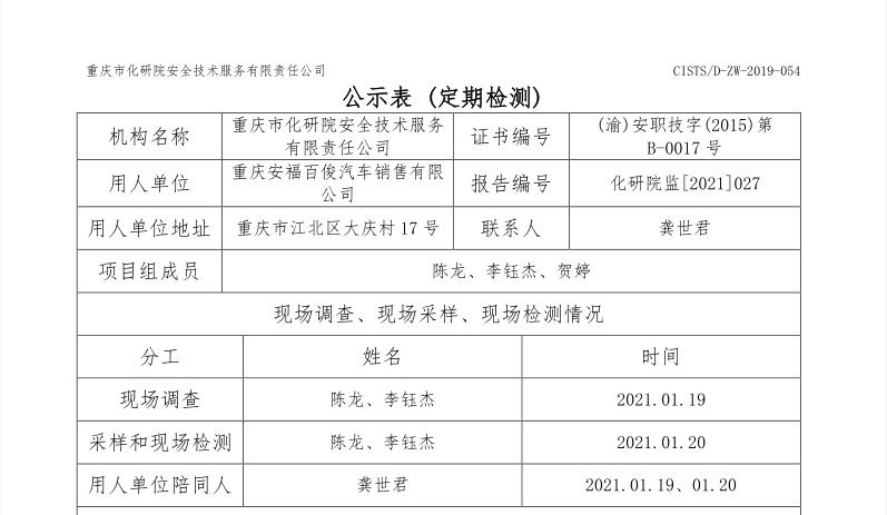 2020年2月重庆安福百俊汽车销售有限公司定期检测