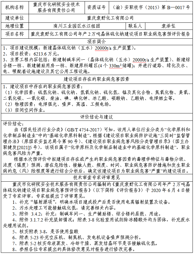 重庆袁野化工有限公司年产2万吨晶体硫化钠建设项目预评价