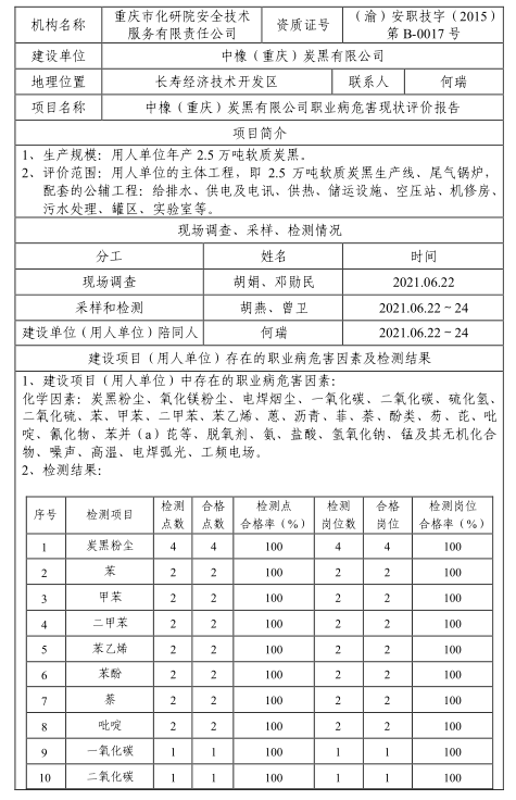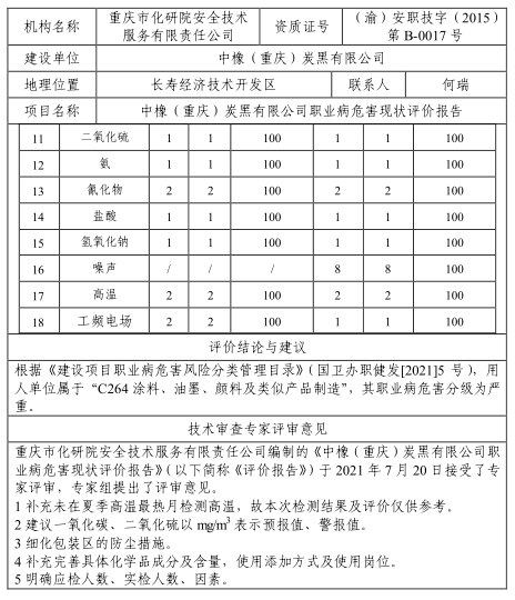 中橡(重庆)炭黑有限公司职业病危害现状评价报告公示表