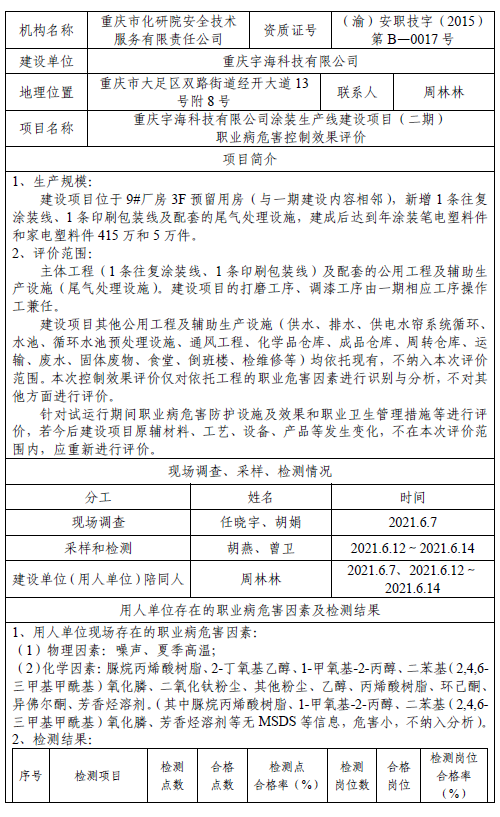 重庆市化研院安全技术服务有限责任公司(以下简称“安技司”)成立于2014年12月,为重庆市化工研究院有限公司全资子公司,专业从事安全、环保、职业卫生和检测等技术服务。