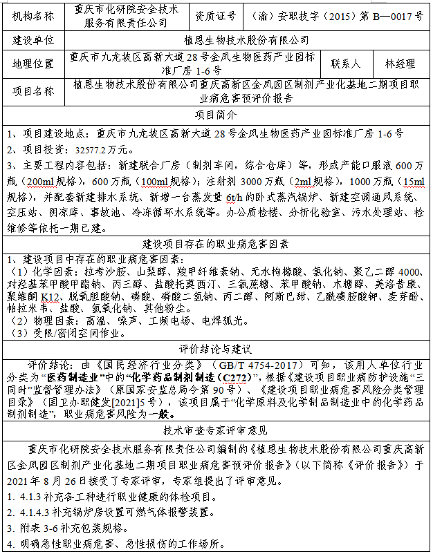 植恩生物技术股份有限公司重庆高新区金凤园区制剂产业化基地二期项目