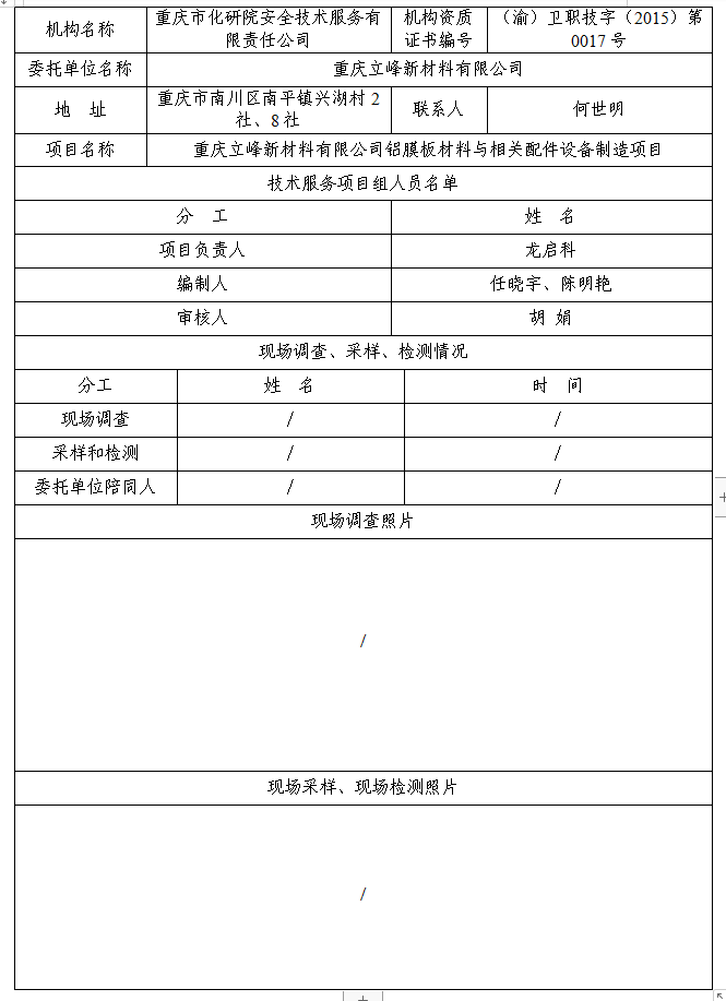 重庆立峰新材料有限公司铝膜版材料与相关配件设备制造项目职业病危害预评价公示表