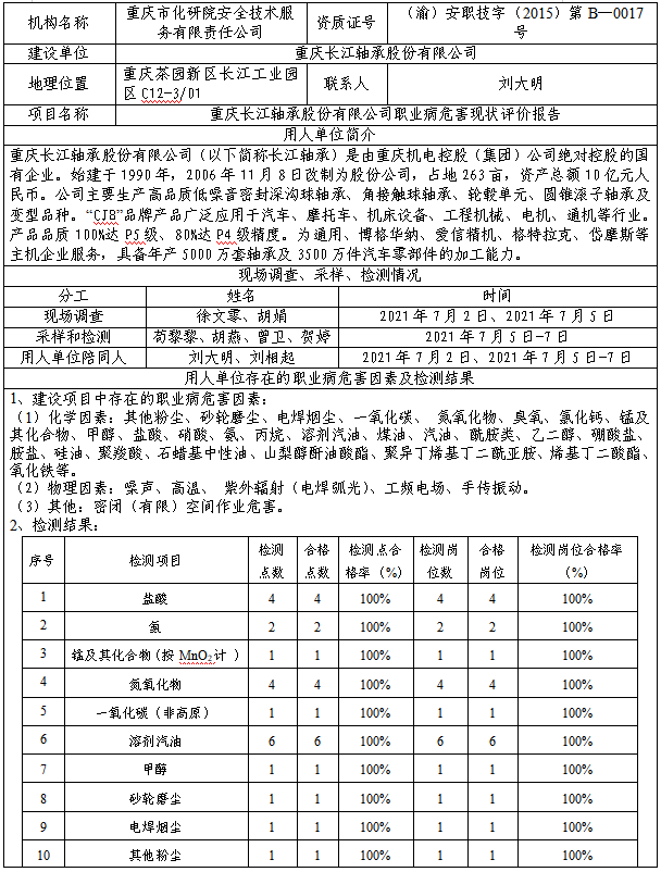 重庆长江轴承股份有限公司职业病危害现状评价公示表