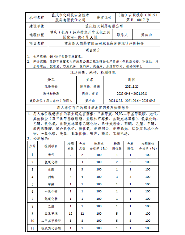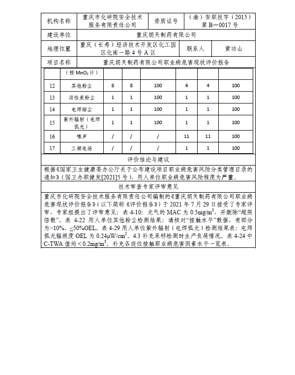 重庆朗天制药有限公司职业病危害现状评价公示表