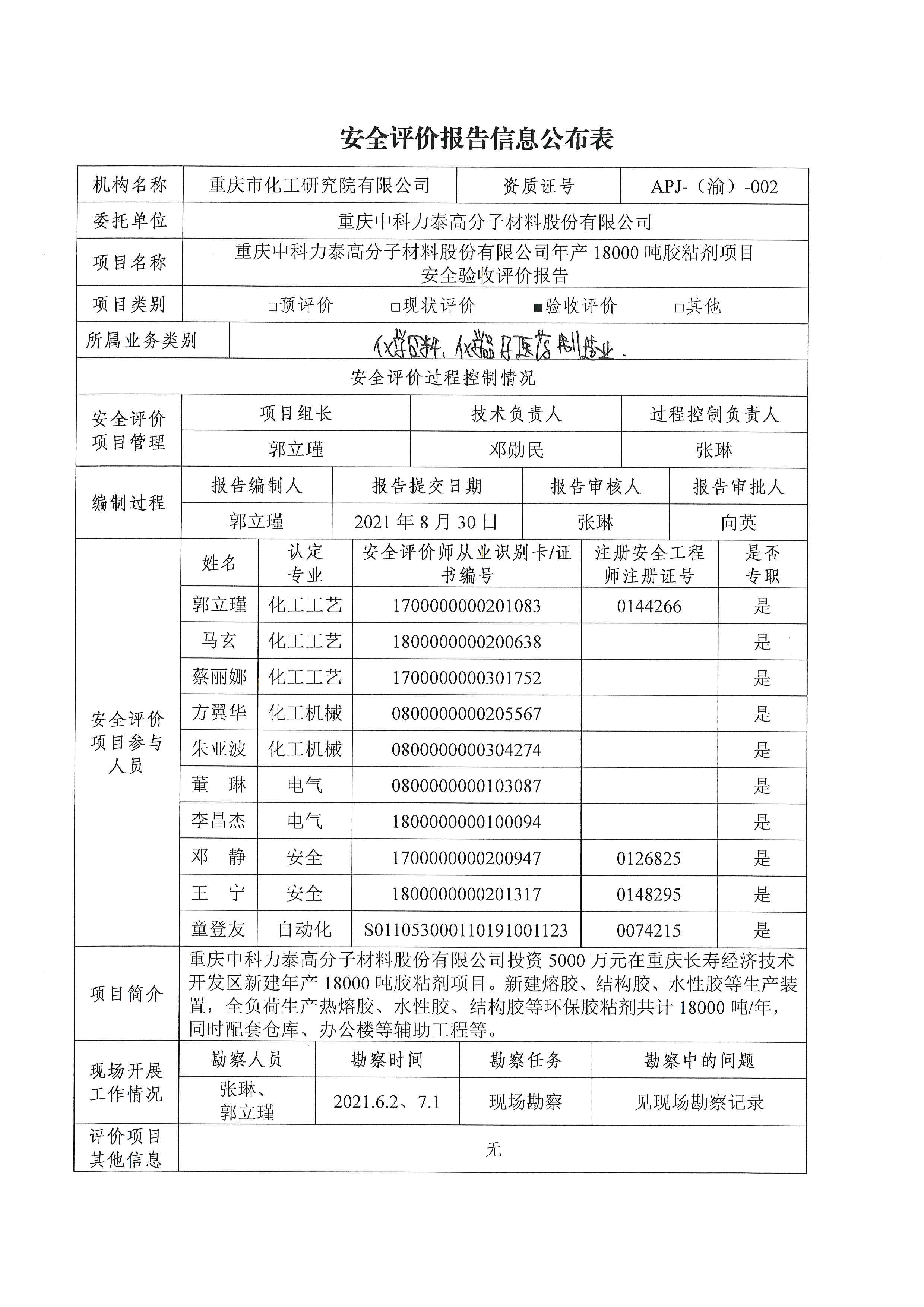 2021年第4季度 重庆中科力泰高分子材料股份有限公司年产18000吨胶粘合剂项目安全验收评价-信息公布表