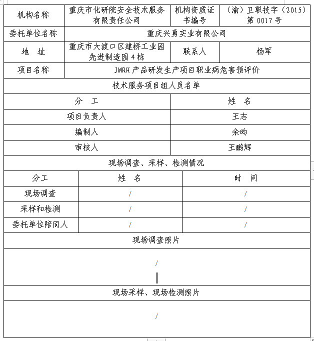 重庆兴勇实业有限公司JMRH产品研发生产项目