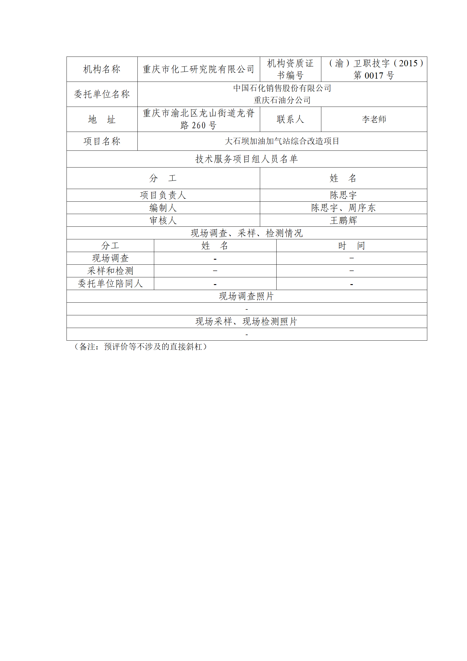 中国石化销售股份有限公司重庆石油分公司大石坝加油加气站综合改造项目职业病危害预评价