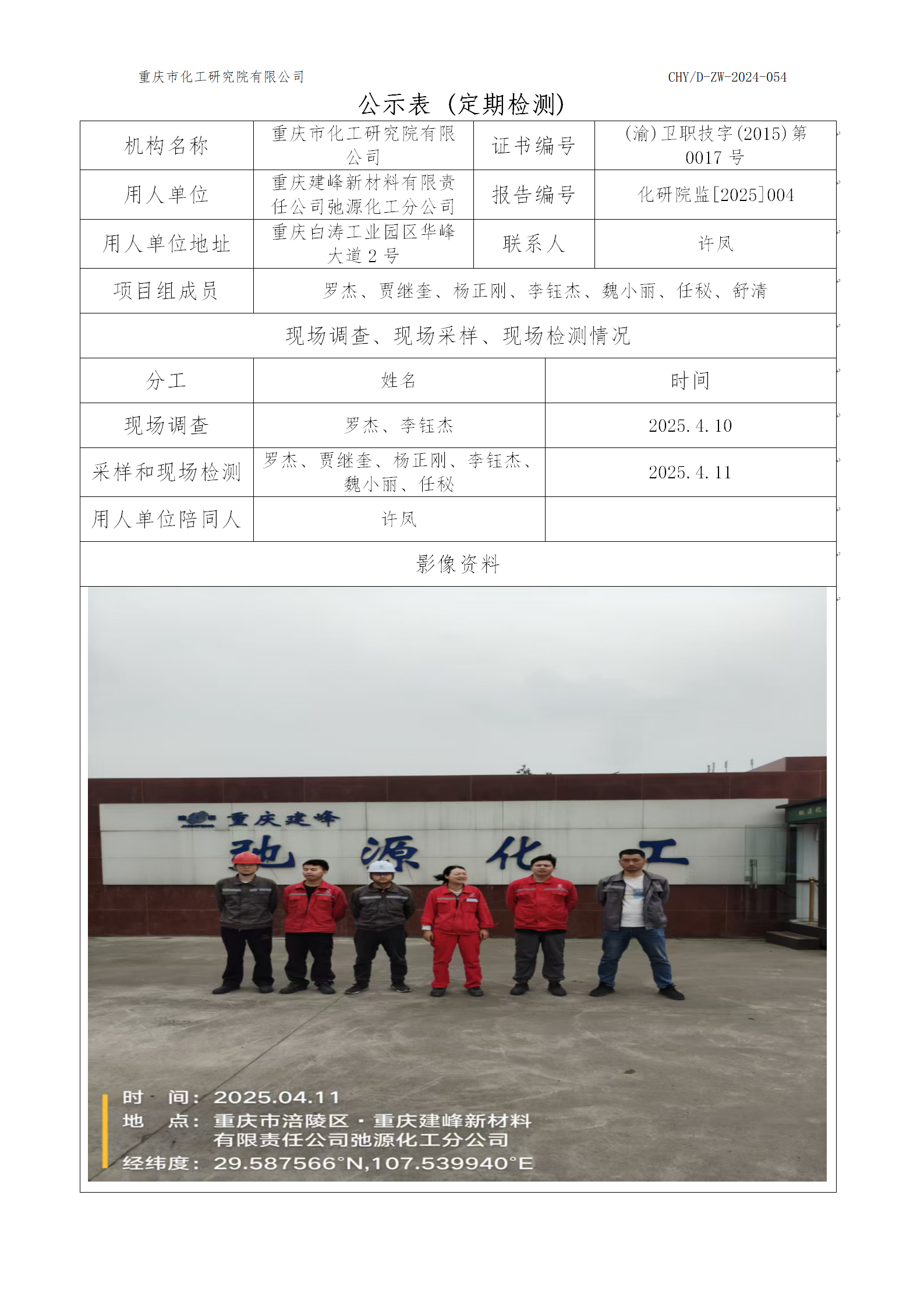 重庆建峰新材料有限责任公司驰源分公司定期检测