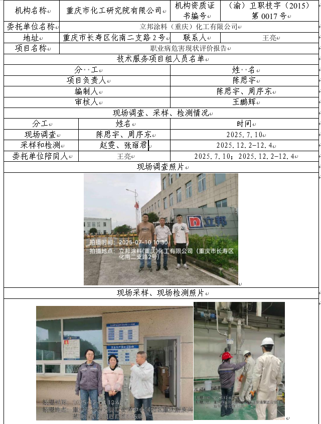 立邦涂料(重庆)化工有限公司职业病危害现状评价