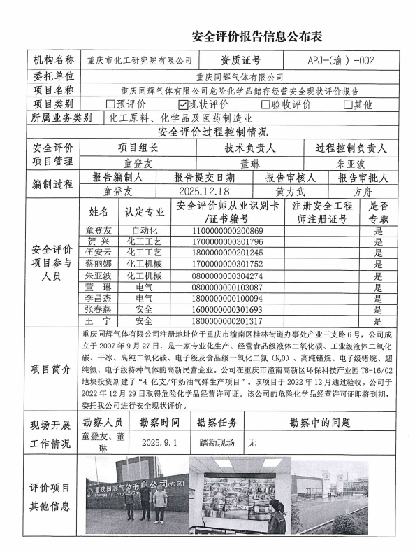 2026年第1季度同辉气体有限公司危险化学品储存经营安全现状评价信息公布表及现场图片