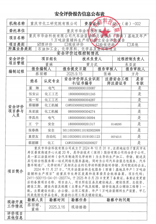 2026年第1季度华涂科技有限公司汽车涂装总包服务(西南)基地及的产1万吨涂装辅料生产项目设立安全评价信息公布表及附现场图片 安全现状评价信息公布表及现场图片
