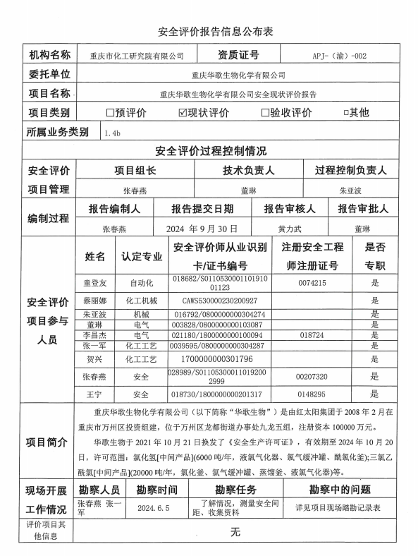 2026年第1季度华歌生物化学有限公司安全现状评价信息公布表及现场图片